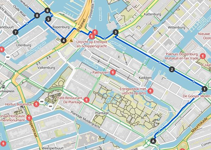 Van de Muiderpoort (A) gaan we via de Sarphatistraat voorbij de Hoogte Kadijk naar de Czaar Peterstraat met de molen De Gooyer aan de Funenkade (1), bij het begin van de Zeeburgerdijk. Over de brug linksaf langs de Oostenburgergracht (2). Hier dichtbij staan het voormalige Oost-Indisch Pakhuis en het oude Zeemagazijn van de VOC aan de VOC-kade. Terug op de Oostenburgerstraat, voorbij de Oosterkerk aan de Wittenburgergracht, staat ’s Lands Zeemagazijn van de Admiraliteit, nu het Scheepvaartmuseum (3). Over de brug rechtsaf steken we de Prins Hendrikkade over, waar vroeger de Zeevaartschool stond, naar de Foeliestraat. Door de Foeliestraat (4) en rechtsaf door de Rapenburg naar het ’s Gravenhekje met het vroegere West-Indisch Huis (5).