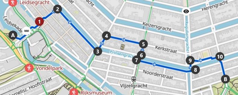 Over de Hogesluis (A), linksaf langs de Amstel op Roeterseiland. Voorbij de Amstelsluizen rechts op de Nieuwe Prinsengracht (2). Aan het einde linksaf in de Roeterstraat (3), langs het Sarphatihuis (4) (het Nieuwe Werkhuis). Linksaf door de Nieuwe Kerkstraat (5), langs de Manegestraat, en rechtsaf door de Weesperstraat (6) naar de Nieuwe Keizersgracht (7). Aan het eind van de Nieuwe Keizersgracht over de Magere Brug (8) over de Amstel, rechtsaf naar de Keizersgracht (9). Via de Leidsestraat (11) naar het Leidseplein met schouwburg (12). Verder over de brug naar de Overtoom (B).