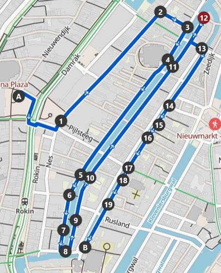 We lopen over de Nieuwendijk (1), langs de Beurspassage (2), de Onze Lieve Vrouwesteeg (3) en de Nieuwe Nieuwsteeg (4) linksaf door Nieuwezijds Armsteeg (5), en nog eens linksaf over de Nieuwezijds Voorburgwal (6). Een zijstraat van de Nieuwe Nieuwstraat (7) is de Suikerbakkerssteeg. Tegenover de Nieuwe Kerk staat het oude Hoofdpostkantoor (8). Rechtsaf in de Paleisstraat (9) lopen we naar de Singel en terug. We lopen terug over de Dam, langs het stadhuis, de Nieuwe Kerk en het monument naar de andere kant van de Dam. Via het Beurspoortje (10) en de Hermietenstraat komen we in de Nes (11). Door de Nes lopen we tot de Wijde Lombardsteeg (12) en gaan rechtsaf over het Rokin (12), waar vroeger het eerste beursgebouw stond, terug naar de Dam (13).